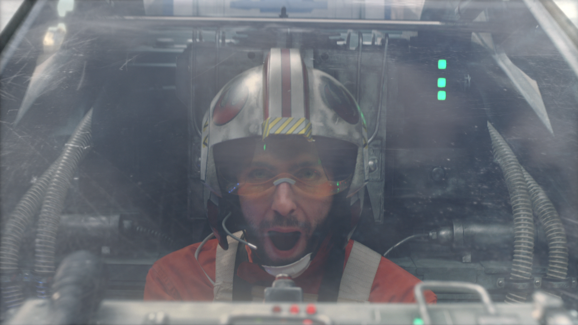We follow the story of our hero as he daydreams through these distant memories when the building shakes and the sound of a jet engine roars, he turns to look outside to find his best friend in an X-wing fighter gesturing for him to join. Naturally, he leaps in to his X-wing fighter and we watch as they fly past a bustling cityscape to the icy planet of Hoth and join their rebellion squadron.